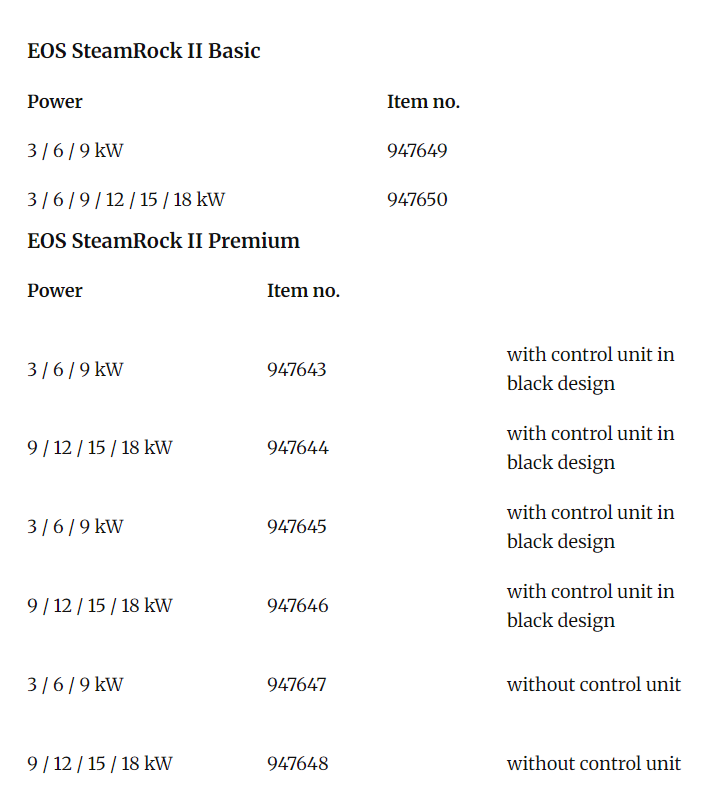 Suitable control unit - e.g. LSG Steam for EOS EmoTouch 3, EOS Econ S2.EOS SteamRock II Premium: Luxury class steam generator with high-performance quality heating elements for steam rooms.Built-in descaling and automatic cleaning system. With control unit – including EOS EmoTouch 3 control panel with colour touchscreen display. Very large scope of functions and features, e. g. coloured light, sound, remote start, etc.Built-in essence dosing system for two fragrances. The power output may be quickly adjusted on site. Flexible installation thanks to variable, extra-large 1 1/4 “steam outlet for efficient operation.Volt-free outputs for bench and floor heating. Outputs for two fans and light (dimmable).